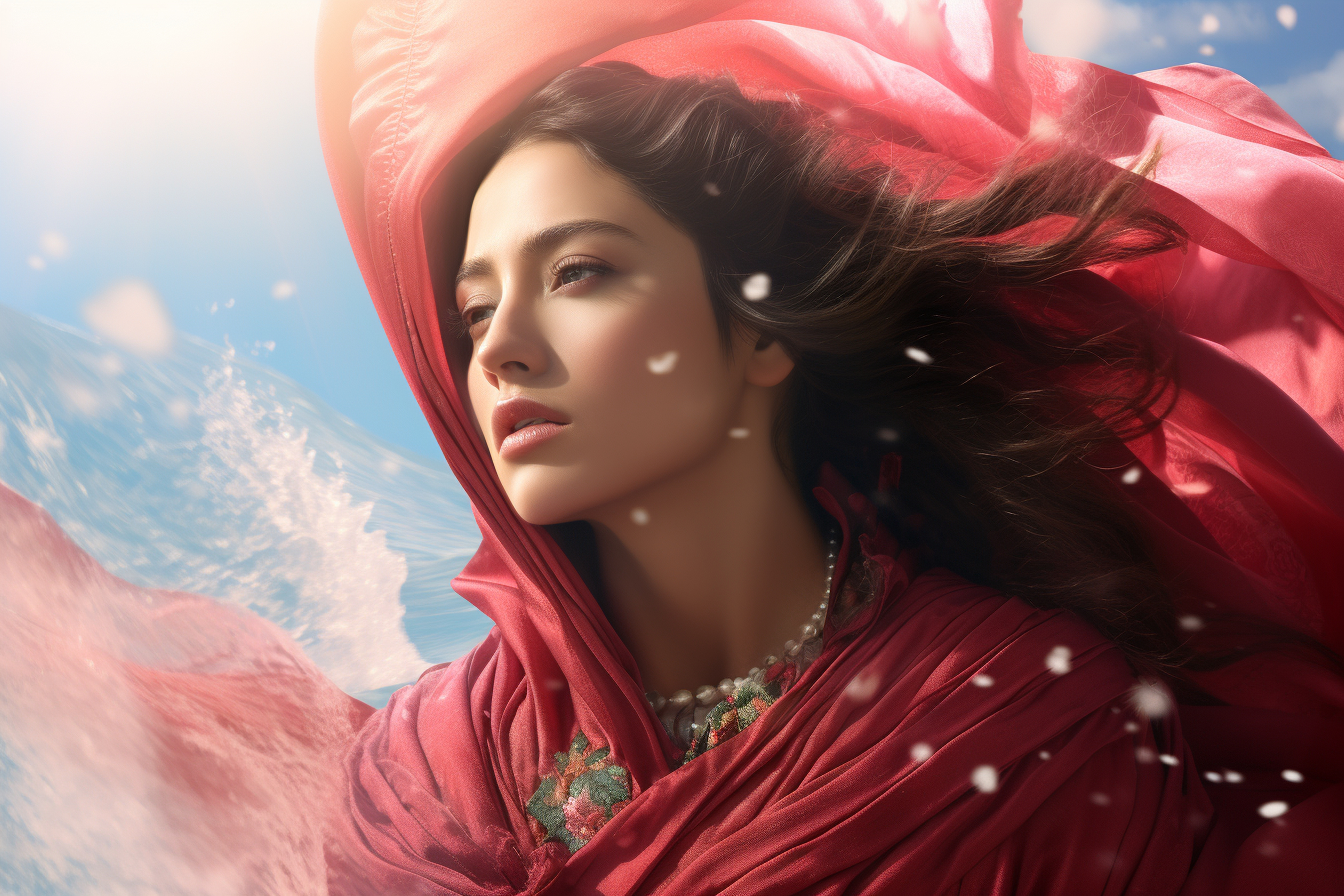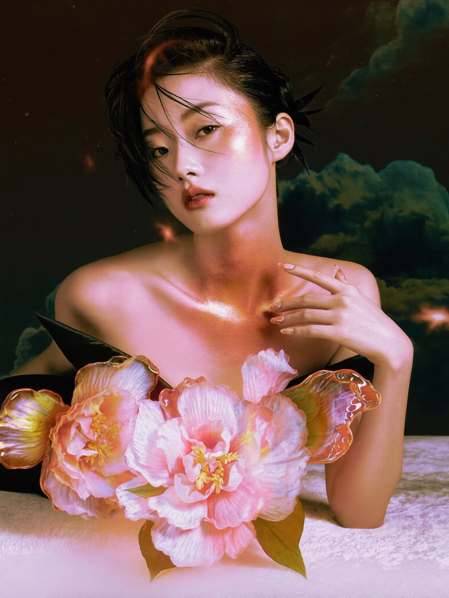 A straight-on, recumbent close-up of a young woman with lustrous, porcelain skin, her head turned delicately towards camera as her hand rest gently atop her collarbone, providing a subtle framing of the face. Her sharp, angular black dress is rendered in a slick matte satin, contrasting against luminous, translucent peony petals and a burned iridescent resin overlay that pools asymmetrically across her chest, creating a captivating duality between fashion and organic fantasy elements. Her makeup is artistic, with warm, rose-gold shimmer pressed on high points of her cheeks and collarbone, complemented by soft gloss lips and subtle smoke-gray shadow at the eyes. Hair is sleek, brushed out and splayed with dynamic tension. She appears atop a plush, minimal platform in a cyclorama studio, with an ethereal airbrushed cloud background and floating refractive light leaks, producing a faint, soft bloom. Light is diffuse, split-lit with an amber key and deep teal rim, casting low, fluid luminous shadows. The polarized palette contrasts shell pink and peachy skin tones against nightfall blue and cool gray. The symmetrical composition, with notably shallow DOF on her features and resin overlay, is polished; digital high-resolution editorial photography, enhanced with diffusion glows, iridescent overlay compositing, negative-space gradients, and iridescent filter effects. Mood is dreamy, intimate, and contemplative. HEX VALUES: ['#0b100c', '#180e05', '#ddcae3', '#d4b9d1', '#e0a6bb', '#c38377', '#040807', '#d59499', '#1e2716', '#c0644a', '#81492a', '#bb734f', '#854415', '#4b2e14', '#a65d34']