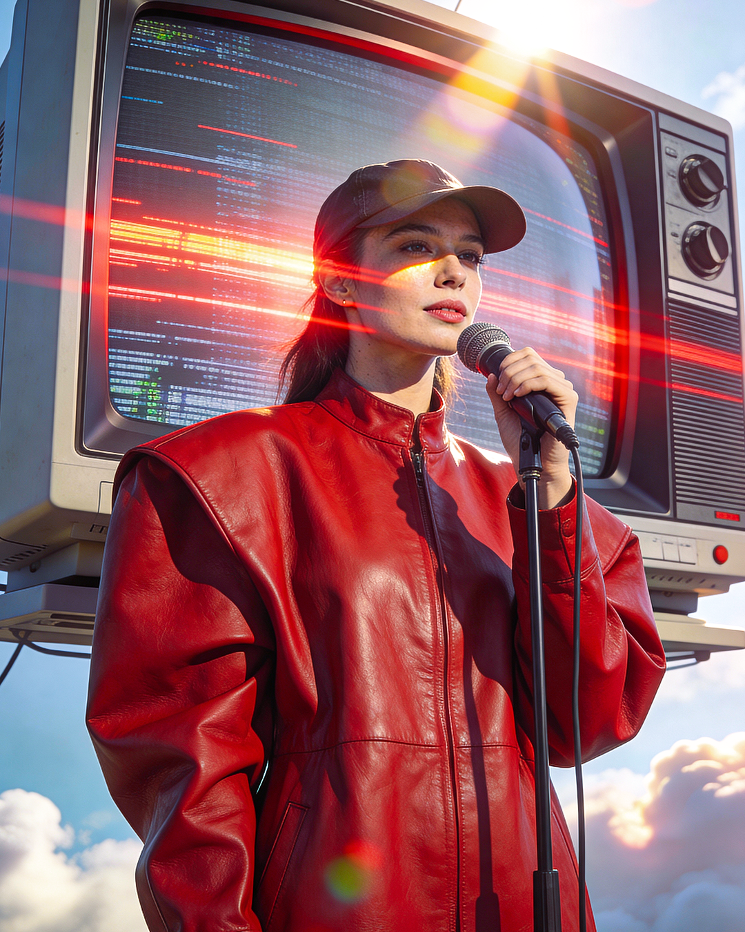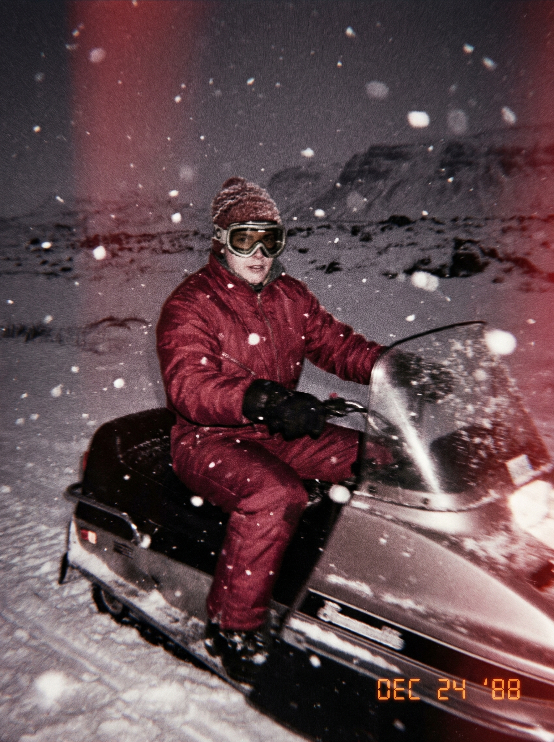 Icelandic landscape, 1980’s, retro fashion model, outdoor clothing, snow goggles, snow, retro, bright colours, nostalgic, analogue photography, moody, abstract, motion blur, film photo taken with a disposable camera, riding snowmobile, nighttime, Realistic,Award winner photography,realistic,Hasselblad H6D camera,80mm lens,F22,1/1000 second,ISO 100,shot on 35mm film --ar 16:9 --v 5.2