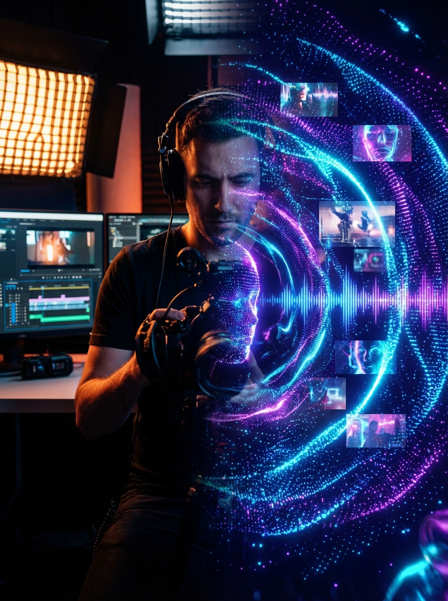 Cinematic split composition, left side realistic creative professional in studio lighting, right side abstract AI energy forming images, video frames and sound waves from glowing particles, seamless blend in the center, neon electric blue and purple tones, ultra detailed, high contrast, futuristic digital art meets photorealism, shallow depth of field, dramatic lighting, homepage hero shot, 8K.