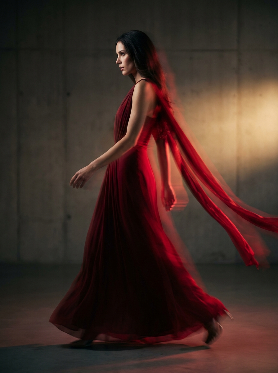 High-fashion editorial motion blur photograph of a woman in mid-run, side profile, dynamic forward movement, strong cinematic motion blur trails flowing behind her, long hair blending into the motion, dramatic studio lighting, minimal neutral background, luxury fashion campaign style, wearing a flowing outfit in deep crimson red instead of black, glowing crimson red light streaks trailing from her back and shoulders, soft golden undertones replaced with rich red highlights, high contrast, moody atmosphere, artistic blur, shot on 85mm lens, shallow depth of field, ultra high resolution, Vogue-style photography, sharp focus on face with blurred body motion, premium fashion aesthetic, 8K, studio quality, dramatic shadows.