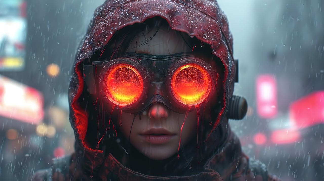 Ultra-realistic cinematic portrait of a hooded person in a rainy cyberpunk city at night.Wearing futuristic round goggles with intense glowing red lenses, wet glass and light streaks dripping down.Moody neon city background with soft bokeh, shallow depth of field.Cold blue tones contrasted with strong red glow.Dramatic cinematic lighting, hyper-detailed skin and fabric, rain particles visible.Centered composition, dark futuristic atmosphere, high realism, 4K.