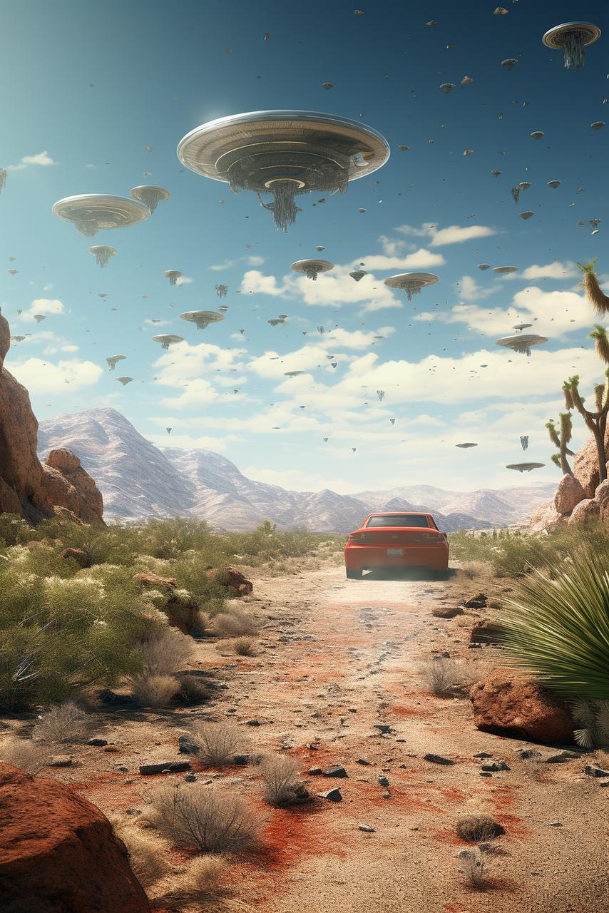 A wide-angle landscape photograph of a red sedan driving away on a dusty dirt road through a desert, scrub brush and Joshua trees, red rock formations. The sky is filled with hundreds of saucer-shaped UFOs, one large and detailed mother ship with mechanical undercarriage greeble in the center foreground, and many smaller ships in the distance. Distant mountains, bright sunny day, warm light, cinematic, photorealistic, sci-fi art. --ar 2:3