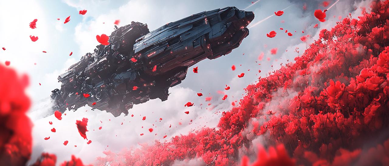 A massive, dark grey industrial spaceship flying low over a vast field of vibrant red poppies, red flower petals floating in the air, turbulence from the ship's engines kicking up petals, surreal juxtaposition, white fluffy clouds, blue sky, cinematic wide angle, intricate mechanical details, greeble, hyper-realistic, 8k, Unreal Engine 5 render, digital concept art, soft daylight --ar 21:9 --v 6.0