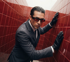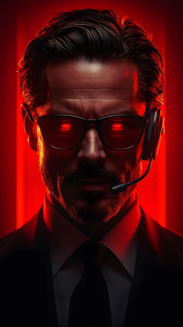 A detailed, close-up portrait of a man with intense, stern features, wearing a dark suit, a black tie, and black-framed glasses. He has a neat beard and slicked-back dark hair. A black headset with a microphone is visible on his left ear. The entire scene is bathed in a dramatic, intense red light from unseen sources, creating strong highlights on his face, hair, and the glasses, with deep shadows. The background consists of vertical red light streaks against a dark, blurred backdrop. The mood is mysterious and intense.