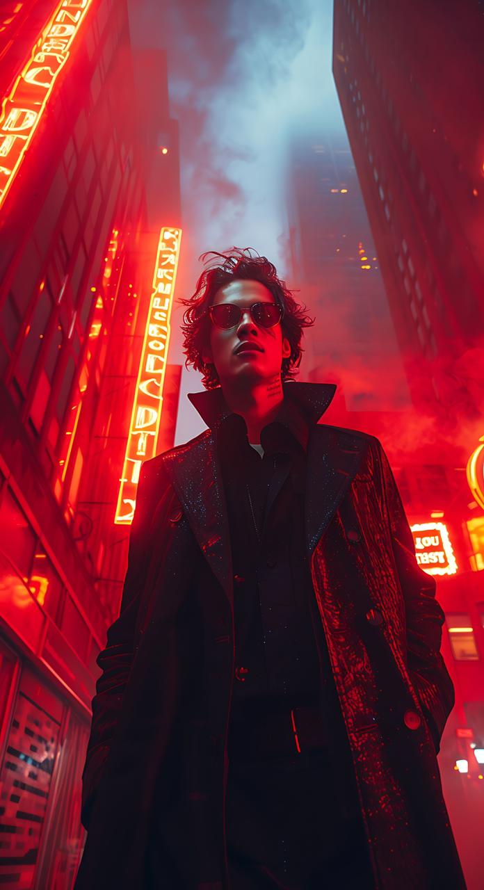 A vertical, low-angle cinematic photograph of a young man with messy, wavy dark hair and a visible neck tattoo. He is wearing round, red-tinted sunglasses and a long, textured dark leather trench coat over a black shirt. He stands in the center of a narrow, rain-slicked urban alley at night, heavily bathed in the intense, saturated red glow of multiple neon signs, some featuring vertical Chinese characters. The wet asphalt ground reflects the red light, and wisps of steam or fog rise around him. The background is a towering canyon of city buildings with blurred neon lights and signs, creating a dense, futuristic, neo-noir atmosphere with high detail and deep shadows.