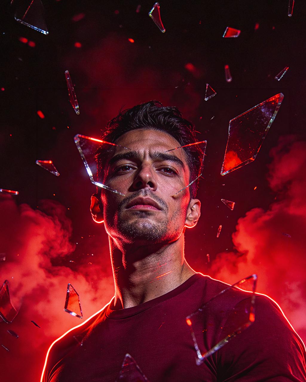 A detailed, close-up portrait photograph of a man with a stubbly beard and short, dark hair, looking directly into the camera with an intense expression. His face is partially obscured by sharp, jagged shards of broken glass suspended in the air around him, with one large shard specifically framing his eyes. The scene is dramatically lit with intense red light and a strong rim light, against a smoky, hazy red background with blurred particles. The focus is sharp on the man's eyes and the glass shards.