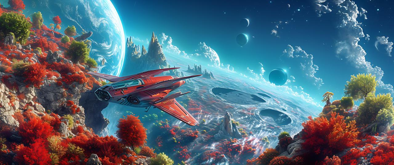 A fantastical sci-fi landscape concept art, featuring a sleek, red futuristic spaceship with swept wings flying over a vibrant alien planet. Below the spacecraft are floating islands covered in a mix of vibrant red and green trees, rocky formations, and deep blue lakes within large craters. The sky is deep blue and filled with dramatic, fluffy white clouds, multiple large planets, and moons of various sizes. The scene is bathed in bright, natural daylight, showcasing high detail and a rich color palette.
