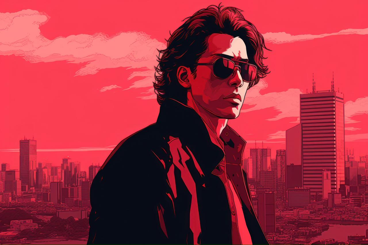 A stylized comic book panel illustration of a young man with medium-length, wavy dark hair and sunglasses, wearing a black leather jacket. He is looking back over his shoulder with a serious expression. The entire scene, including the sprawling urban cityscape with skyscrapers and the cloudy sky in the background, is rendered in a striking monochromatic deep red color palette. The lighting is dramatic and high-contrast, with heavy shadows and bold line work, creating a cool, noir-inspired atmosphere.
